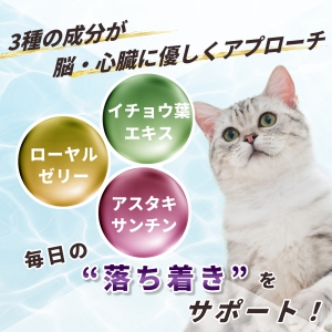 | 原材料名 | 鰹節粉末、ビール酵母、デキストリン、カツオエキス、乾燥ローヤルゼリー末、マタタビ末、ウコン末、イチョウ葉エキス末、ビタミンC、プロポリスエキス末、ヘマトコッカス藻色素(アスタキサンチン含有) |