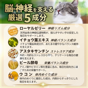 | 原材料名 | 鰹節粉末、ビール酵母、デキストリン、カツオエキス、乾燥ローヤルゼリー末、マタタビ末、ウコン末、イチョウ葉エキス末、ビタミンC、プロポリスエキス末、ヘマトコッカス藻色素(アスタキサンチン含有) |