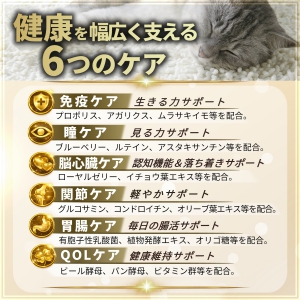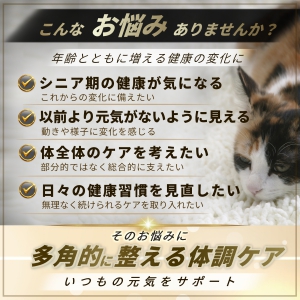 | 原材料名 | 鰹節粉末、ビール酵母、カツオエキス、マタタビ末、グルコサミン、米糠、プロポリスエキス末、乾燥ローヤルゼリー末、卵黄末、アガリクスエキス末、サケ軟骨抽出物(コンドロイチン含有)、有胞子性乳酸菌、ウコン末、MSM、イチョウ葉エキス末、V.C、植物発酵エキス末、ブルーベリーエキス末、オリーブ葉エキス末、ガラクトオリゴ糖、イソマルトオリゴ糖、抽出V.E、カロテン色素、ヘマトコッカス藻色素(アスタキサンチン含有)、ナイアシン、マリーゴールド色素(ルテイン含有)、ヒアルロン酸、パントテン酸カルシウム、V.B1、V.B6、V.B2、V.A、葉酸、V.D、V.B12 |