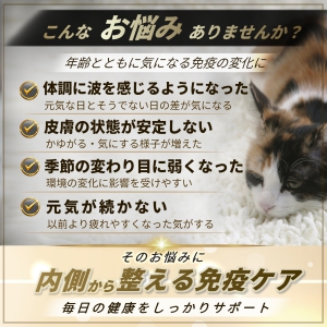 | 原材料名 | 鰹節粉末、ビール酵母、デキストリン、カツオエキス、プロポリスエキス末、アガリクスエキス末、マタタビ末、ビタミンC、有胞子性乳酸菌 |